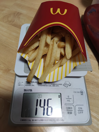 Lサイズで毎回140g〜150gなので 何個も注文するとお店が得してます。 現在大幅な値上げもしてるので かなり儲けてますねー。 (駅前でお客様が多いお店なのでかなり お店が得してますね。) 恐らく計量しないで目分量で提供してるので このお店のLサイズ頼んでも Mサイズの量なので マクドナルド公式サイト Mサイズは、135gなので Lサイズ買う意味無いと思います。