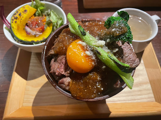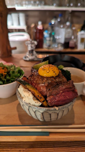 焼き始めたのが20分後くらいでした。 え?今焼き始めた?と驚きました。 かなり待ちました。 ランチだったので20分くらいでサクッと出たかったのですが、こちらも事前に確認すればよかったですが、ランチのコースでもないのにステーキ丼にこんなに待たされるとは思いませんでした。30分近く待ちました。