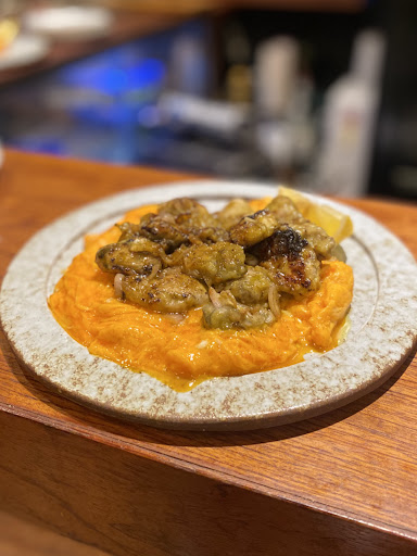 今回のMVPは、、、 なすとウニのフリットです。 熱々に揚げられたナスの上に贅沢な使い方をしたウニを乗せるといった至ってシンプルな料理。文章力不足のため、上手く説明できないが、ナスの素材の味と衣のサクサクとウニの濃厚さが相まって美味しかったです。