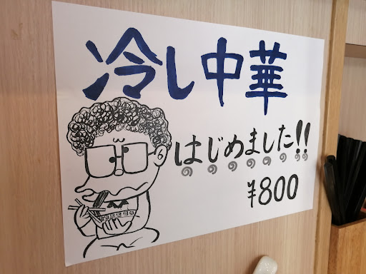 先客3人は確定しているので、手持無沙汰もあって店内の掲示物をチェックし始める。 『毎週土日は煮玉子か大盛り無料』…いつ休むのだろうかこの店は。 『ランチメニュー+とろろ丼』…半ライスなんかでなく「とろろ」というのが良いな。 『冷やし中華はじめました』…確かにこのところ暑い。自分は食べないけど季節感は感じる。イラストは小池さんなのか? 『スープ多めです』『しょうがらーめんの食べ方』…等々。 他に誰のものかは判然としない色紙が5枚ほど壁に掛けられていたが興味なし。