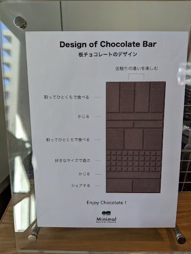 Being passionate about dark chocolate, I spotted this shop on the review made by the website damecacao on Tokyo chocolate makers. I bought 3 chocolate tablets and drank one hot chocolate drink. There are a lot of positives in my review. First, I was super happy to find in Tokyo very dark chocolate tablets, meaning 90% cocoa. In Japan, it is often hard to find dark chocolate above 70%. They have two types of 90% cocoa bars, one being a kind of Ciiccolate di Modica although much more refined. Second, the packaging is really nicely done with a lot of information. lt reminds me of the Geneva based Orfeve tablet bars (see a previous review). Unfortunately, the info in Japan is different from what you can find in Europe, and it makes it hard to compare European and Japanese chocolate bars. Third, their matcha chocolate tables is exceptional... possibly the best in the world high flavour that remains for quite a long time on your palate. Not too high in sugar killing matcha taste, unlike many other matcha chocolate bars (and yes I do not like sugar) especially in Europe. The quality of macha is also definitely higher. Fourth, the tablet has been very well designed with smaller and bigger bits and also exhibits different surfaces (flat or striped). It reminds me of the Zurich based Garçoa tablet design. What could be improved? The hot chocolate drink was very intense in taste. Unfortunately, they have only one choice, which is...