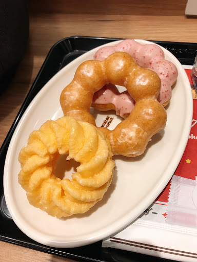 Read more聖蹟桜ヶ丘駅の高架下にあり、駅を出て高架沿い東へ歩き、横断歩道を歩けば正面にあるので雨の日に濡れなくて済むので便利。 聖蹟桜ヶ丘で待ち合わせたり、電車の時間を調整したり、買い物の後、ちょっと立ち寄るのにも良いロケーションだと思います。 品揃えは問題なく、接客もチェーン店の中では、割りとしっかりしている。 店内はあまり広くないので、イートインするのであれば、先に席を確保しておくことをオススメします。 アイスのドリンクを頼んだ時には店員さんに言えば、紙のストローをもらえます。 飲み物を頼まなくても、水を頼めば出してくれます。 お気に入りはティラミスとクリームが乗ったチョコドーナツで、甘すぎず、絶妙な相性。 駅近なので大量にドーナツを買い込んでもすぐ電車に乗って移動できるのも助かります。 秋口にいって、ホットのロイヤルミルクティーを飲みたかったのですが、ホットはコーヒーかストレートまたはレモンティーだけだ...