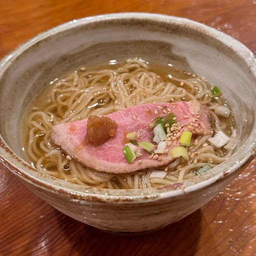 ●〆の塩そばの意外性と満足感 コースの最後に提供された塩そばは、期待を良い意味で裏切るものでした。 帆立と鶏胸チャーシューが贅沢に使われており、スープには魚介の旨味が凝縮されていました。さっぱりとしながらも深みのある味わいで、コースの締めとして完璧でした。ラーメン屋としても営業している店の技術がしっかりと活かされており、一口ごとに満足感が高まりました。この塩そばだけでも再訪の価値があると感じました。