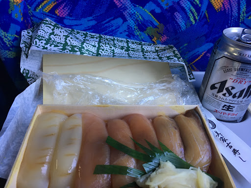 For ¥2500 you get seven - YES ONLY SEVEN - pieces of sushi, and only three varieties of fish. The chef said the fish were local to kozushima, and that was true solely for the red squid. The tuna and amberjack are standard sushi for all of Japan.