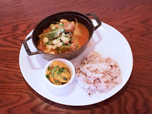 「ストウブランチ(豚タンのやわらかトマト煮)」:1100円(税込、以下同) 味3.6点/CP3.8点 所謂「ストウブ鍋」を使った煮込みです。大きな豚タンが入っていて、とても柔らかく煮込まれています。他にジャガイモ・豆・人参・インゲン・ひき肉・キャベツなど色々入っています。トマトソースで煮込まれているのですが、薄味に思いました。薄い味が好みの自分でも薄いと思いましたので、濃い味がお好きな方には物足りないかもしれません。もう少しだけ香辛料か塩分か酸味を効かせても良かったかな。 主食を五穀米かフォカッチャを選択でき、五穀米を選択しました。五穀米にしては柔らかな加減のものでした。 サラダとデザートとドリンクも付いて1100円は高コスパだと思います。
