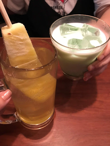 乾杯は カクテル 抹茶ミルク(込540円)冷凍パインサワー(込422円) 大きなパイナップルはマドラーも兼ねて美味しのでグイグイは危険です