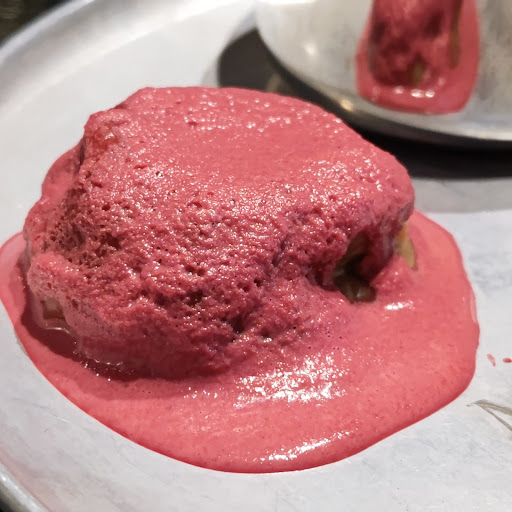 『シーフードモモ』はクラムチャウダー風でカレー味。 ホワイトソースがかかっています。 『ポークモモ』はシナモンスパイス。 『チキンモモ』はターメリック。 『ベジモモ』は大葉などの野菜が入っていて ピンクのビーツソースがかかっていて可愛い。 『チリモモ』は揚げたモモで、チリ風味に青唐辛子。