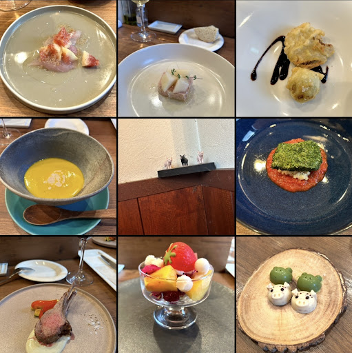 4 of us enjoyed lunch course ¥6,000/person sharing the seven seater counter with another couple. Nowhere in the US could one have such unique high level course for the cost. COSPA! The chef gracefully paces out perfectly executed unique dishes that wowed and surprised us. The few wines paired well with the dishes. Cannot pick a favorite but loved playful dishes like the fritti of foie gras & muscat grape enjoyed with a glass of Riesling. The soup was exquisite with literal layers of flavors. Chef recommends not to mix. The initial fish carpaccio had a hidden flavor and texture of picked Japanese vegetables similar to takuan (mom knew name…I don’t recall). Delicious pâté brightened with pear and fresh thyme. I felt quite full but enjoyed the surprises and layers of flavor and textures in his visually beautiful deconstructed playful dessert. And are there pop rocks in the chocolate🐷?We enjoyed conversations with the chef who spends the week at his other business La La Tarte. I like the no frills but high quality simple setting and intimacy of the counter. If you can reserve a seat on Saturday or Sunday...