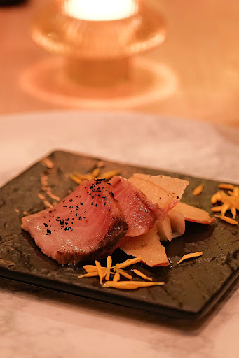 As many resto were fully booked for the night, we were fortunate to have my friend help us in booking this French restaurant. . We ordered the Standard Dinner Course, which began with the amuse-bouche. The amuse-bouche consisted of Sashimi and Corn Mousse with Premium Italian Parma Prosciutto. The sashimi was delicately presented, with precise slices which were visually appealing. It paired with the apple slices nicely, creating a harmonious combination. The corn mousse was smooth and tasted savoury with the parma prosciutto.