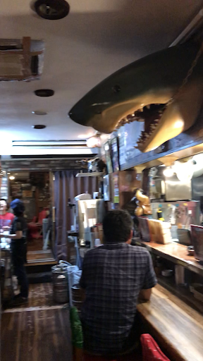 Steak prepared by a Japanese pro wrestler in a space decorated with memorabilia & a shark head.