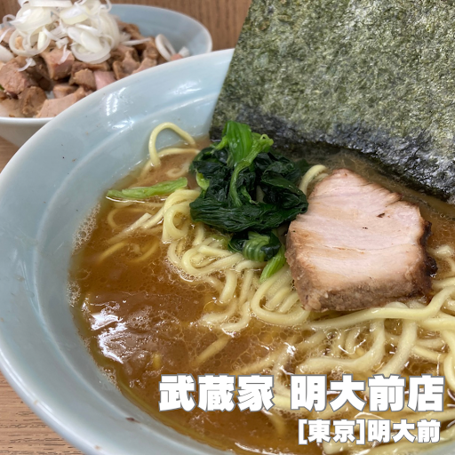 横浜ラーメン 武蔵家 明大前店@東京都杉並区永福1-1-1 シャトレ明大前1F どうも、さぴおです ______________ 🟦コスパ最強家系!まったりと濃厚さ抜群の武蔵家系譜でライス無双!!  ̄ ̄ ̄ ̄ ̄ ̄ ̄ ̄ ̄ ̄ ̄ ̄ ̄ ̄ [点数] 83点 ☆3.8 [アクセス] 『明大前駅』(190m) [注文メニュー] ラーメン並850円+チャーシュー丼100円+ご飯2杯(無料) [並び・システム] 並びなし・チケット制 [食材] 動物出汁、鶏油、豚チャーシュー、ほうれん草、海苔、ネギ、中華麺。 [味] 豚骨醤油、こってり