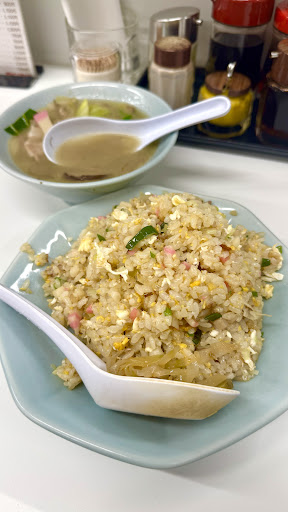 そして、五目チャーハンが届きます。五目チャーハンのダブルというメニューもありましたが、なんだろ。チャーハン大盛りのことかな?謎は増すばかりです😇五目チャーハンは、シンプルな味付け。味は薄いかなと思うので、卓上の醤油を少し回しかけるくらいがちょうどいいです。パラパラ系というよりはベチャベチャ系の仕上がり。スープが意外と思ったより塩味あるので、醤油かけなくても食べれると思います。