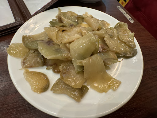 「小エビチリソース煮(税込1700円)」やら「鶏肉とカシューナッツ(税込1700円)」、「青椒肉絲(税込1700円)」を食べたい候補に心の中で挙げていたが、それを食べたらちゃんぽんが食べられそうにないので、もう「皿うどん(税込1000円)」をまずオーダー。 …皿うどんの具材はキャベツやモヤシ、アサリ、イカ、そしてかまぼこ。パリパリ細麺の皿うどんは酒のオツマミに案外合う。辛子をつけていただいても同様。