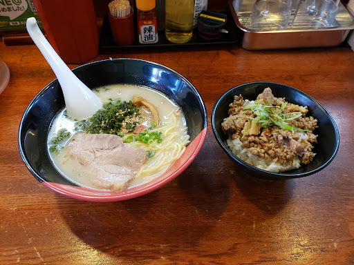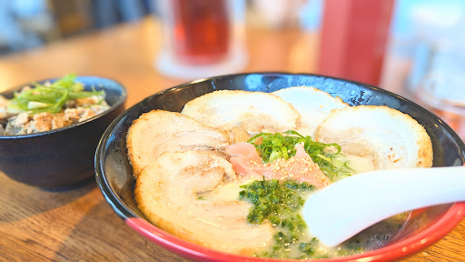 スープは、白濁色の豚骨ラーメン。麺は熟成麺と赤麺?から選べます。最初なので熟成麺を選択しました。 この手のラーメンには珍しく中細麺です。 具は、チャーシュー1枚、メンマ、あと青海苔?を細かくしたものが入ってました。 面白いことに食べてると清涼感を感じました。若干ですがお寿司屋さんのガリみたいなものも入ってました。 面白いラーメンです。 チャーシュー丼の見た目は、チャーシューというよりソボロみたいな感じです。ネギの量も少なく焦がしネギのイメージはありませんが、程よい塩味で美味しいチャーシュー丼でした。