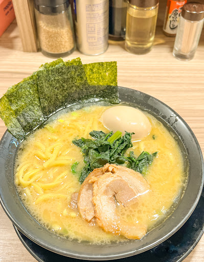 少し待つと、ラーメンが運ばれてきました。麺はうどんに近いくらいの太さで、スープは家系らしい安心な味わいでした。具材としてはほうれん草、味玉、チャーシュー、海苔がトッピングされています。