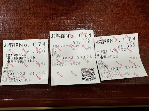 No frills noodles, donburi and fried chicken in/out eatery. So many options to choose from while trying to quickly order on the machine. The process is you would choose and pay on one of the 3 machines (English is an option on the machine), make your payment with yen, coins or payment cards like Suica, print a ticket and sit at a seat, staff will retrieve your ticket(s) and voila your food will be delivered on a tray in minutes. They also provide roasted brown rice cold tea which is delicious. We ate there 3 days in a row ... literally everything was so yummy. We noticed many locations within Tokyo so please check it out as the prices are crazy cheap and food...