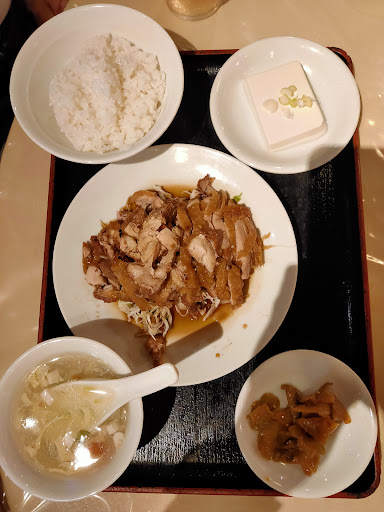 蒸し鶏はしっとり柔らか。 葱と生姜風味のタレが食欲をそそり、少し濃いめの味付けがご飯が進ませる。