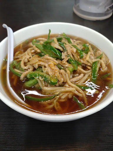 青椒肉絲(チンジャオロース)の漢字にある「青椒」は唐辛子を辛味を抜いて改良したピーマン・ししとうなどの緑色の果実。「肉絲」(ロースー、ロース、ルースーなど)は、細切り肉の意味。 ピーマン、タケノコ、肉を細切りにした物を炒めた料理がのった麺が出てきたので、肉絲麺(ルースーメン)は青椒肉絲をのせた中華麺のことか。麺は中太。 ジャンボ餃子は大きくて一口では食べれない大きさ。 味は普通に美味しい。海老チャーハンとか、焼肉丼も美味しそうだったので今度寄ること...