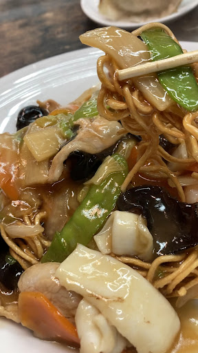 ◆五目カタ焼きそば 熱々で提供されるので、湯気が凄い凄い! 甘酢が効いているとろりとしたあんは、程良く酸味が感じられ、good! 麺は中細麺でカリカリに揚げられていますが、あんが絡むことにより、少ししっとりとするので、最高! 具材、あん、麺、どれをとっても非の打ち所がない逸品でした!!