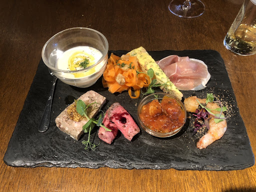 Read moreAvui hem celebrat un casament en aquest restaurant. Està situat en una segona planta i consta de taules i barra. Decoració moderna i acollidora. El menú ja estava decidit prèviament. D’entranta ens han servit una pissarra amb truita de patates i pebrot, pernil, vichyssoise de ceba, una gamba crua macerada, pop a la gallega, tall rodó fred i paté de campagne. Tot molt bo, sobretot el pop, que era molt tendre, i la vichysoisse era cremosa i amb molt bon gust. De primer ens han servit verduretes a la brasa amb talls de carn de vedella tendríssima. I per acabar, el millor del dinar, rissotto de bolets amb foie, una delícia!!! De postres hem menjat un pastís de xocolata negra espectacular!!! Tot acompanyat de cervesa, vi negre i vi blanc. Tots els pots deliciosos i ben cuinats. Molt...