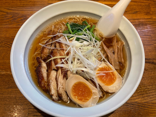 Read more2025年2月、平日の18:50頃訪問。店内はカウンター席が二列あり計10脚とテーブルが1卓あるしつらえで、先客は1名いらっしゃる。上湯しょうゆ味玉ラーメン(780円)に麺大盛り(100円)をプラスしてワンオペの店主に口頭注文する。上湯とは鶏を穏やかに煮出して濁らないよう抽出した澄んだスープで云々、という説明を見ながら待つこと5分くらいで提供となる。スープをすすれば鶏のいい匂いが薫り、旨みがどっしりと舌にのし掛かってくる。若干甘めに寄っていて、コックリとした深みが深い。そして、かん水に由来するのだろうか、後口に微かにアンモニアっぽい風味がたなびくが、これがなんとも郷愁を誘う。うま味調味料はほとんど感じられず、鶏、野菜、乾物でスープを作っているのだろうが、このどっしりした旨みを創出する店主の腕には非凡さを感じる。麺は均質にムチっとした、いわばゴム感のある細麺。前述した通り、かん水臭があって妙に旨い。大盛りの麺量は茹で前250gほどあろうか、ボリュームに不足はない。チャーシューは鶏の塩焼きか、皮目の焦げた匂いが強烈な香ばしさを放つ。鶏肉からもじんわりと旨みが滲み、誠にもって美味しい。しかもたっぷりあるのがうれしい。あとで調理風景をみて気づいたのだが、これは"焼き鶏”ではなく、油で揚げた“揚げ鶏”でした。味玉は期待値通りの旨さで安心する。総じて、コスパ良く、鶏の旨みを堪能できるお店だと思います。次回は...