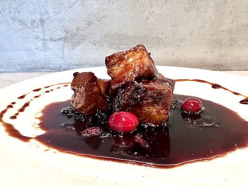 ◆海老の黒チリソース イカスミと豆板醤のソース マスタードも入ってる、湯剥きトマト、ニョッキ。 プリっプリのエビにこのソースが合う!!この黒チリソース辛い!笑、でもとっても美味しいソース✨ ニョッキと絡めてもめちゃうま!! 今のところ今日1かも⭐