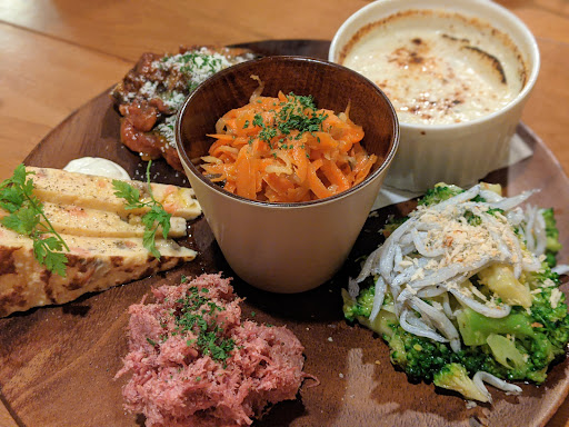注文したもの・おすすめ順 「栃木ココファームのアルコールフリー ワイン 」(690円) 「えらべる3品の前菜」 (1,200円) 「チーズ1種」 (600円) 「鳥取大山鶏むね肉 レモンバターのソテー」(1,880円)