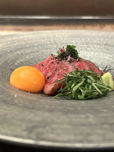 前菜で出てきたグリーンピースのムース グリーンピースは焼売の上に乗ってるから食べるというくらいサブな存在でしたが← 上に乗っている湯葉との相性が良く豆の旨みをダイレクトに感じられてグリーンピースの美味さを知りました。笑 もう一つの前菜、和牛のタルタル。 カリカリに焼かれたバケットと共に口へ。 和牛がとても柔らかくユッケのよう。 美味しすぎてお肉への期待がさらに高まります。 和牛のジュレは添えてあるネギと紫蘇と一緒に食べる事でさっぱりかつ出汁の奥深い味わいがたまらない一品。 特に美味しかったのは塩焼きでいただくタン元。 分厚くカットされているのに歯でサクッと切れて、ジューシーすぎて幸せ( ´﹀` ) イチボは甘い脂とさっぱりポン酢との相性抜群。 ランプは肉本来の味が濃く、上記で説明したフランスの塩が美味すぎて感動。 本日の野菜はそらまめ。炉端×拘りの塩 想像だけで美味いやつやん…と焼く前から確信しつつも、大粒でふっくらしたソラマメでほっこり。 胃もたれの改善にもなるので先程食べたお肉が重くない、これも計算されているのか…と思うとハイレベル。野菜も食べられるのは嬉しいポイントですね。 タレ焼きのハラミはしっかりタレが染み込んでいて美味すぎ。私はそのまま味わいましたが、ニンニクをつける食べ方もおすすめだそう。 焼肉屋に行ったら食べたい焼きすきはなんと自然薯&卵黄につけて食べるというこれまた新しい。 セリも新鮮で、上質な肉とととろが口の中でとろける(...