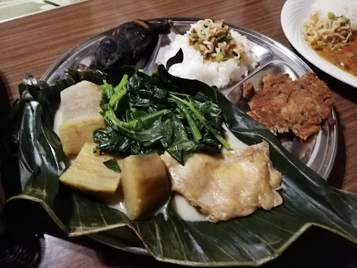 現地の味を完全に再現した【南国プレート】は、お芋や鶏肉、クッキングバナナを焼いたものなど様々。ちゃんと説明もしてくれますか。特に味付けをせず、素材の味を楽しみます。ご飯の上に乗っているものは、パプアニューギニアの袋麺とシーチキンなどを合わせた、現地でよく食べられているものです。 味が薄いと感じる方用に、お塩もあります。