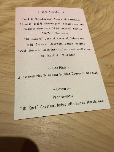 Read moreThis Michelin star resturaunt was classic and sophisticated. The staff was friendly and welcoming , taking your coats in the beginning. It is a whole experience, having each dish explained to you in detail as it’s served as well as watching the chefs prepare in directly in front of you. Each dish was beautiful and carefully prepared and the chef seems proud of his work. They were kind and asked me multiple times in English if I was enjoying the meal. I got to enjoy the 11 course kaiseki set that was healthy and beautifully prepared with seasonal ingredients. I was given over 5 cups of tea to complement the meal. The menu changes monthly so this is just a taste of what they have to offer. A wonderful...