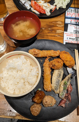 Read moreAll-you-can-eat seafood, yes please! This place also has other menu items such as miso soup, fried fish and prawns as well as curry sauces. We opted for the all-you-can-eat and drink for 1875 yen per person for 45 minutes, adding 75 for every 5 minutes after. It's a good start if you're getting into eating seafood, as there were over 10+ items to choose, from baby squids, imitation crabs, to tuna and whitefish. I really liked the fried prawns, and tasting the baby squids was new to me. Sake there is plentiful, and the staff there were very helpful despite speaking limited English. The female staff guided us through the self-serve area, as well as how to pour the drinks and informed us of the extra 75 yen charge.
