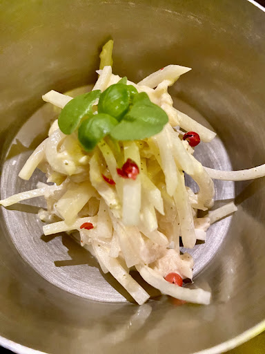注文したのは12,100円のコース。 サラダ仕立てから始まるこのコースは、日本の季節の食材と中国料理の相乗効果を堪能できる。 相乗効果と言うとありきたりな表現かもしれないが、こういう文化を掛け合わせた料理が1番感動するのは私だけでしょうか。 日本で食べるなら日本の旬の食材を使うのが鮮度の面で考えても合理的。それを中華3千年の歴史が紡いだ調理法で仕立てる。 政治なんか関係ない。一皿の上で友好的な日中関係を築いています。
