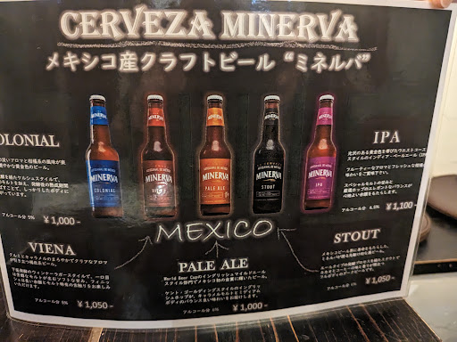 僕らが最初のドリンクに選んだのは、メキシコのクラフトビール。何種類かあって一番味のバランスが良いと言われて「ミネルバペールエール(税込1000円)」をオーダー。…ワールドビアカップで金賞受賞しているクラフトビール。美味しいが、バランスとしてはやや濃いめのビール。味はそれなりに主張してくる。