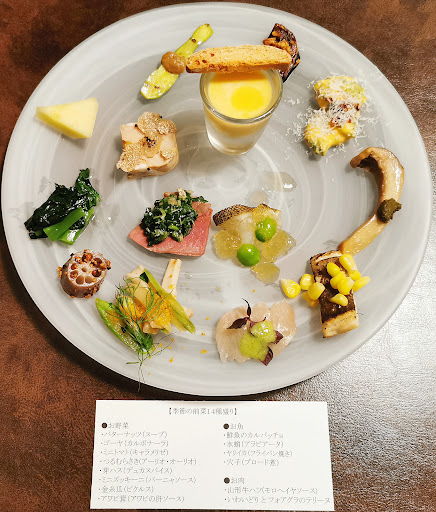 ・季節の前菜14種盛り 当日か下記の14種が供された。 NG食材の代替にもしっかり対応してくれて、どれも手が込んでいて美味。 バターナッツのスープ ゴーヤのカルボナーラ ミニトマトのキャラメリゼ→生トマトNGのため、長芋のロースト・アグロドルチェ(甘酸っぱい)ローストナッツ添えに変更 つるむらさきのアーリオ・オーリオ 芽ハスのデュカススパイス ミニズッキーニのバーニャソース 金糸瓜のピクルス アワビ茸のアワビの肝ソース 鮮魚のカルパッチョ 水蛸のアラビアータ→アラビアータNGのため、アイナメ炙りのカルパッチョ・コンソメジュレ&新銀杏添えに変更 ヤリイカのフライパン焼き 穴子のブロード(鶏出汁)煮→赤パプリカと万願寺唐辛子のマリネ添えがNGのため、とうもろこし(ゴールドラッシュ)添えに変更 山形牛ハツのモロヘイヤソース いわいどりとフォアグラのテリーヌ・マスタード添え→マスタードNGのため、トリュフに変更