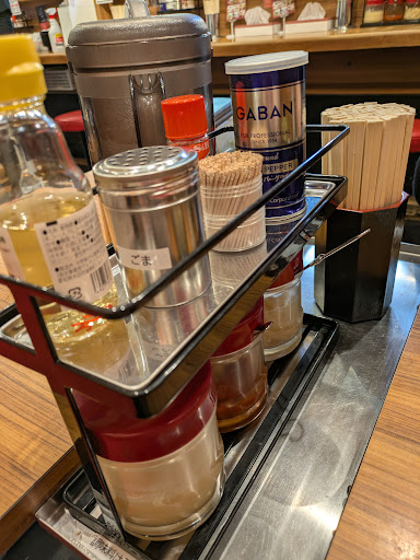 いつも醤油らーめん(麺柔らかめ、味薄め、油ふつう)にトッピングでホウレンソウを頼んでいます。 味ふつうでもかなり塩辛いので、初めての方は薄めがおすすめかも知れません。 厨房の店員さんによって味の濃さに少しバラつきがありますが、楽しめる程度です。 チャーシューが柔らかく、脂身が好きな人にはおすすめできます。 デフォルトで玉ねぎが少しだけ入っていますが、これも無料で入れることができます。 味変にブラックペッパーと一味がおすすめです。後半は酢を入れるとスープがさっぱりしてサラサラと飲めますね。