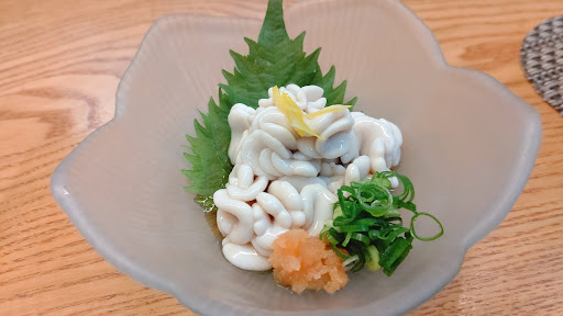 【本日のお品書き】 ⚫︎長ナス揚げ浸し 干エビのせ 干エビの食感が良いアクセントで美味しい ⚫︎シマアジお刺身 ねっとりのシマアジ珍しい ⚫︎きつねのもちもち焼き ⚫︎大椎茸焼き 見た目かわいいし味付けがちょうど良い ⚫︎揚イカシュウマイ ⚫︎豚ハラミみそ漬串焼 食感よく美味しい! 個人的には鶏より豚 ⚫︎赤皮かぼちゃの冷製ポタージュ 生ゆば入り トマトっぽい風味感じる ⚫︎大山地鶏モモ串焼き ⚫︎冷しすだちうどん 安定の讃岐うどん