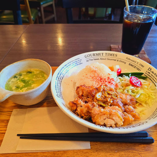 駅前にあったオリーブというカフェに13:30頃に入店。先客2組。 ランチメニューは3種類あったので、Aの台湾風鶏の唐揚げ(ダージーパイ)にしました。ごはん、千切りキャベツ、白菜スープ、ドリンクがついて税込1030円。 ドリンクはコーヒー、紅茶、ハーブティーをそれぞれホットかアイスで選べたので、アイスコーヒーにしました。