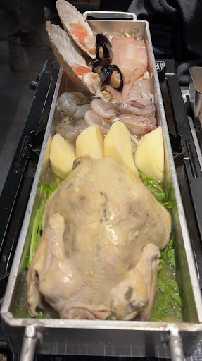The waiter started cutting the seafood aggressively and started splattering everywhere. Then they raised the heat to max and left it high boiling for over 15 minutes. My partner and I saw the exact moment the waiter glanced at our table and he realized he messed up. He panicked and asked his coworkers what he should do. He came back to our table and opened the seafood pot and there was barely any liquid in it and you could see that the bottom was burnt. He tried to play it off and started cutting the seafood for us to eat and I asked him in Korean, “Didn’t you overcook this?” and he was startled because he didn’t know I could understand everything him and his coworkers were saying. He said, “Oh yeah.. that’s why we’re going to get you more broth.”