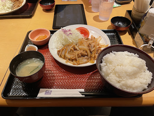 お味噌汁で口を整え、いざ生姜焼きに挑む。 玉ねぎと豚肉にソースがまとわりついている。 ソースだけでも白米が進んでしまいそうだ。 おかずとお米のバランスが良く取れない。 特盛にして大正解。