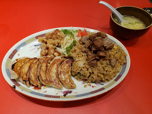 そんなこんなで数分後に到着。ジャンク感満載のビジュアル。ワンプレートといえば格好がいいですが、お皿の上には炒飯、餃子(6個)、唐揚げ(2個)、サラダがのっていてたまごスープもついてきます。これで1000円はなかなかお得かもしれませんね。
