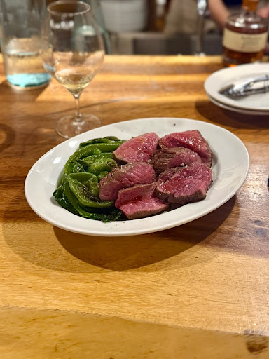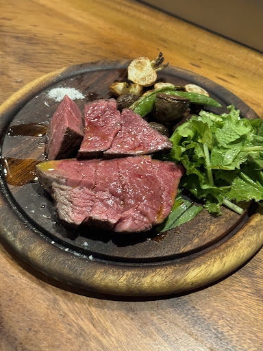 1番のお目当てだった牛肉は、絶妙な塩加減で レア感が残っていて美味しかったです。 付け合わせはツルムラサキとピーマン。 素材の味わいが引き立ちます。