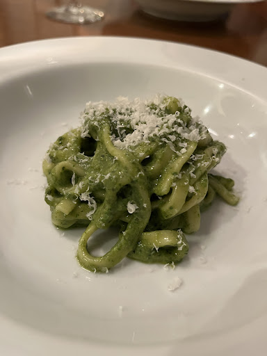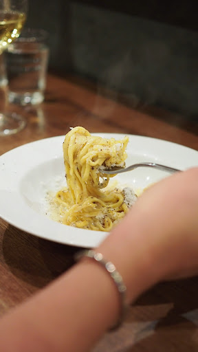 口コミを見て必ず食べると決めていたのがカチョエペペ!実際頼んでみると想像通り、いや想像を超える美味しさでした。 麺は細めの平打ち麺で、ぱっつんと歯切れ良く手打ちならではの食感がたまりません。 そこに超濃厚なチーズがよく絡んで、塩味は強めなのですがもう止まらないほどの美味しさ!荒めに挽かれた黒胡椒の刺激にも後押しされて、あっというまにひと皿平らげてしまいました。正直、もう一皿食べたいくらい美味しかったです。大盛りにすれば良かったかも(笑)