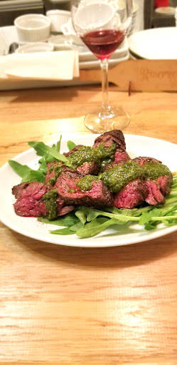 今まで我慢に我慢を重ねてきたので、1日ご褒美と先程の『魚秀禅』で勢いがつき、箍が完全に外れた私は次に前々から御挨拶をしたいと思っていた池ノ上にできたワインバルに向かいました。 下北沢の名店クオーレフォルテ、フェガートフォルテで腕を振るっていた青森県出身の8月8日生まれ(店の名前はここから)一戸シェフが独立して作った新店です。 私も長きにわたりイタリアンで仕事をしてきて(接客)つくづく思うことは、確かにある程度の技術は必要ですが、最後に残る大切なことは人なのだと言うことです。 人に集まったグループには信用と信頼、店に対する愛着が生まれます。 だからこそ打算のない人柄の良い方が居る店は長く残り愛されるのです。 そんな意味で言うと、この一戸シェフは本当に人柄が良いと思います。 狭いからこそ目が届き、出来る限りのリクエストに答え、美味しいものを提供する。 当たり前のように聞こえますが、嫌味なく自然にできることは才能だと思います。 大変申し訳ないことに、この前にさんざん飲んで食べてしまったので、ここでは ◻️◻️◻️◻️◻️◻️◻️◻️◻️◻️◻️◻️◻️◻️◻️◻️◻️◻️◻️◻️◻️ 『牛ハラミのタリアータ、サルサベルデ添え』◻️◻️◻️◻️◻️◻️◻️◻️◻️◻️◻️◻️◻️◻️◻️◻️◻️◻️◻️◻️◻️ しか注文できませんでした。 肉は強火で一気に焼き色を付けて、芳ばしい香りをまとわせ、オーブンに入れてじっくり焼き上げ、ワイルドな肉を喰らうと、言う表現がぴったりと合います。 そこに添えられたサルサ(ソース)ベルデ(緑)は伝統的なソースで通常は北イタリアの郷土料理『ボリートミスト』(色々な肉の煮込み料理)に付けて食べるスタンダードソースですが 今回はパセリを多く使うところ、ルッコラを使い、ケッパーとビネガーを効かせることで、単調な肉の味に変化をつけてありました。 苦味が旨味と合わさると深い奥行きになり、ビネガー(酢)が味を締めて肉自体の味を際立てます。こうすることで単調で飽きやすい肉料理がいつまでも食べていたいという変化をします。 その肉の余韻が残る口の中に添加物のない管理された葡萄そのままを感じる赤ワインを流し込む至福は何にも代えがたい幸せです。