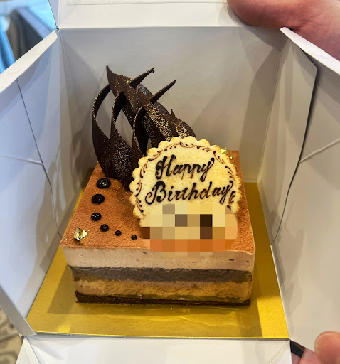 バースデーケーキはカレンダーケーキもあります。今年はチョコレート、ホワイトチョコムースの2層のケーキをチョイス。 苦味の効いたチョコとほんのり甘いホワイトチョコ。苦味が好みのチョコ好きにはたまりません。