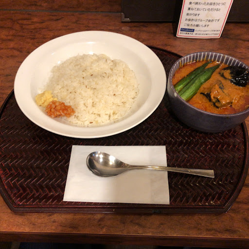 チキンカレーは、鶏ガラスープを素に作ったさらさらしたカレーで、鶏もも肉とキャベツ、トマト、水菜等が入っている。クミンライスの平皿にカレーを掛けて味わう。 ジューシーな鶏もも肉とスパイスが効いたカレーの旨み、トマトの爽やかな酸味とキャベツと水菜の食感がバランスよくて癖になる。 アチャールとすりおろし生姜を少し混ぜたりして味の変化も楽しむ。檸檬などの柑橘系も合いそう。