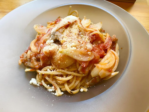 パスタは菅野製麺所がつくる生麺パスタを使用。丸みのある乾麺とは異なり、四角い切り口の角麺。生麺ならではのモチモチした食感。濃厚なソースやさっぱりしたソースもしっかりと絡みつきます。