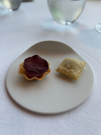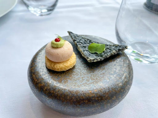 *プティサレ 海苔の風味が効いたおせんべいのようなものとフォアグラの風味が効いた一口サイズの料理でした。 どちらも手でつまんでいただけます。 最初のドリンクをいただきながらサクッと食べました。