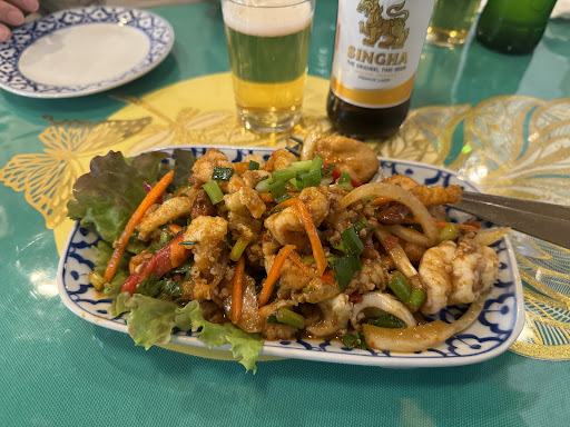 ●ヤムカラポプラー(魚の浮袋と海老和えサラダ) 1800円 揚げた魚の浮袋や海老、イカ、ひき肉をタマネギ、パプリカ、人参などの野菜と一緒に甘酸っぱいドレッシングで和えたサラダ。魚の浮袋は中国では漢方や高級食材としても用いられ、タイには中華系タイ人が多いため中国料理の影響を受けた料理も多いそうだ。辛味、酸味、甘味のバランスが絶妙。