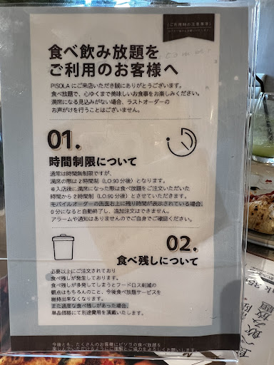 Read more平日夜、5人家族幼児有り、食べ放題スタンダード ファミレスより良い点は店内の内装くらい。あとは まぁまぁ〜悪い点が気になるとの間。 店員からのシステムの説明はほぼない。パウチされた利用方法を読んでと言われて、席の場所を適当に言われるだけ、場所までは案内されなかった。入り口付近は客席とキッチン、ドリンクバーとの通り道なので、道塞いで説明してられないのかもしれない。 食べ放題を頼んだが、混雑時は時間制限かかるとの表記はHP上にも記載あるが、帰宅時はウェイティングはゼロだったが時間制だった。何を根拠にしているのかもわからないし、説明も全くない。説明がないから不信感すら感じられる。 料理は値段相応。良いものもあれば、悪いものもある。総じて言えば料理の提供時間はピザだけは遅かったが、あとはそこまで遅くもない。ピザ釜が小さそうなので、これは改善されないかもしれない。ちなみにバケットの提供に20分以上時間がかかった。一緒に食べようと思っていたものを残しており、提供を待って注文を止めていたために時間が過ぎてしまい、食事は最後まで楽しめなかった。提供されたものも、乾燥している割には温かくもなかった。提供するのに、時間がかからないと思う料理なので、まぁ多分これは頼む人があまりいなくて、忘れ去られただけなんだろう。 イカのフリットは10ピースくらいが、くっついて3ピースくらいになっていた。ナイフで切り分けて食べる必要があった。 フライドポテトは2回注文し、最初はケチャップ、2回目はフリットについてくるバジルトマトソースだった。どちらが本当だったのか?温かくもなかった、揚げ置きなのかな。 パスタは提供時間を意識し過ぎてか、茹で時間が足らず固い、だけならまだしも粉っぽさを感じるレベル。 お皿が熱くなっておりますと言って通路側に布で持って皿を置いていく。確かに熱く下手すると火傷するレベルのものもあった。それ、どうやって奥の席の人に渡せばいいの?結局手を拭いたあとの、おしぼりで縁を持つことになった。子供の頼んだアイスは提供時すでに下半分溶けていた。これも熱い皿にアイス乗せているのか? ホールを回っているスタッフは料理配膳ばかりがメインで皿を下げる余裕がなさそう。 お皿下げますねと行ってから30分弱来なかった。皿も重めのものが多いので、複数枚重ねると女性スタッフ(女性しか来なかったが)には片手ではきついと思う。提供する料理が手元に残っていると、ついでに下げられないんだろうと思う。