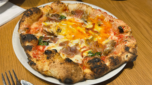 そしてお待ちかねのピザタイム。 まずは定番中の定番「ビスマルク」を注文。 ピザ好きとしては外せない一枚ですが、こちらのビスマルクはとろとろの卵と塩気の効いた生ハムの相性が絶妙で、まさに王道の味わい。 生地ももっちり&香ばしく、焼き目のバランスも完璧。ピザ窯の火力のすごさが伝わってきます。